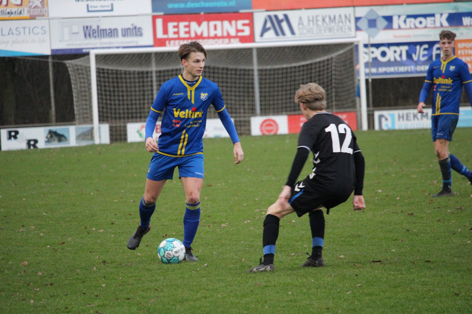 In de 22ste minuut werd de ban gebroken. Goed voorbereidend werk op rechts van Léon Dogger en Levi Aitink werd bekroond door Juliën Derks met een doeltreffende inzet van dichtbij: 1-0. In de periode erna bleef een geconcentreerd spelend Vroomshoopse Boys de bovenliggende partij met daarbij aanvallende impulsen van beide vleugelverdedigers Jesper Derks en Simon Kempers. Boys-spits Jordy Harms kreeg vanuit een kluts in de 38ste minuut een uitgelezen mogelijkheid te scoren te verdubbelen. Zijn harde schot vloog echter net naast het doel van De Zweef. Zo werd met een stand van 1-0 gerust.