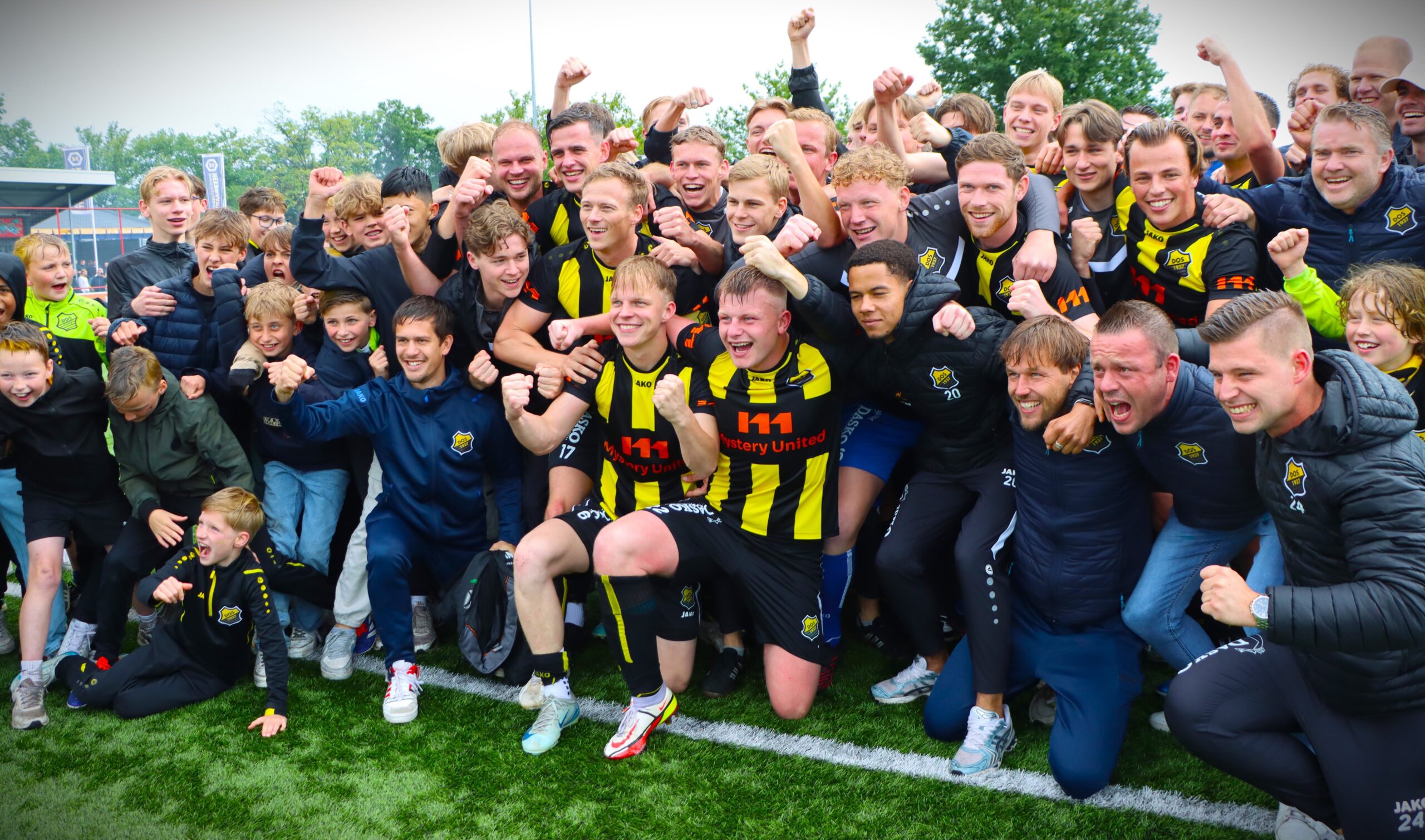 Uiteindelijk floot de goed leidende scheidsrechter Illian Groothuismink af en stormden de supporters het veld op. Na een jaar afwezigheid keert DOS’37 terug in de 1e klasse. De spelers werden op ons sportpark onthaald en het feest ging nog lang door in Vriezenveen.