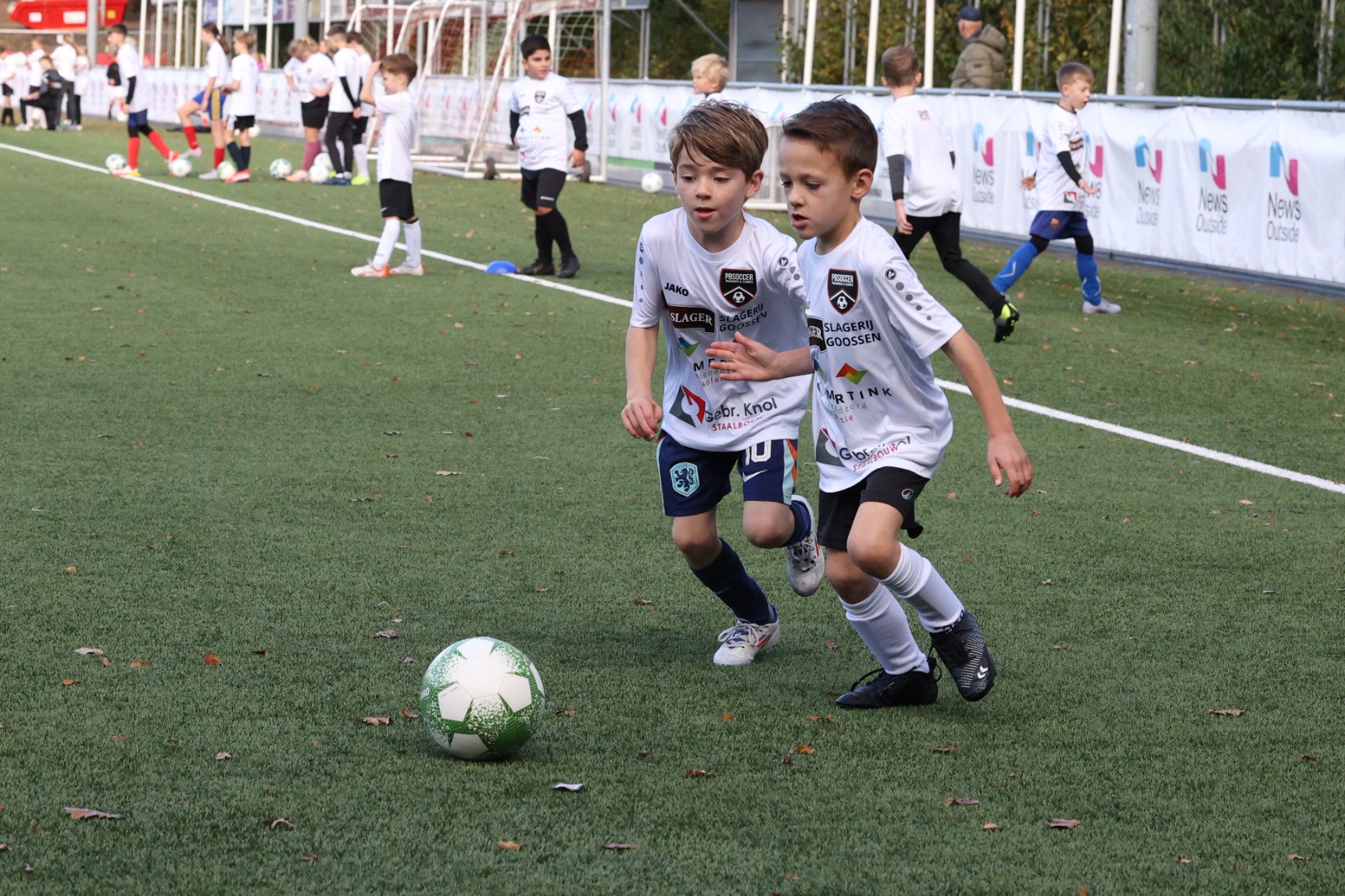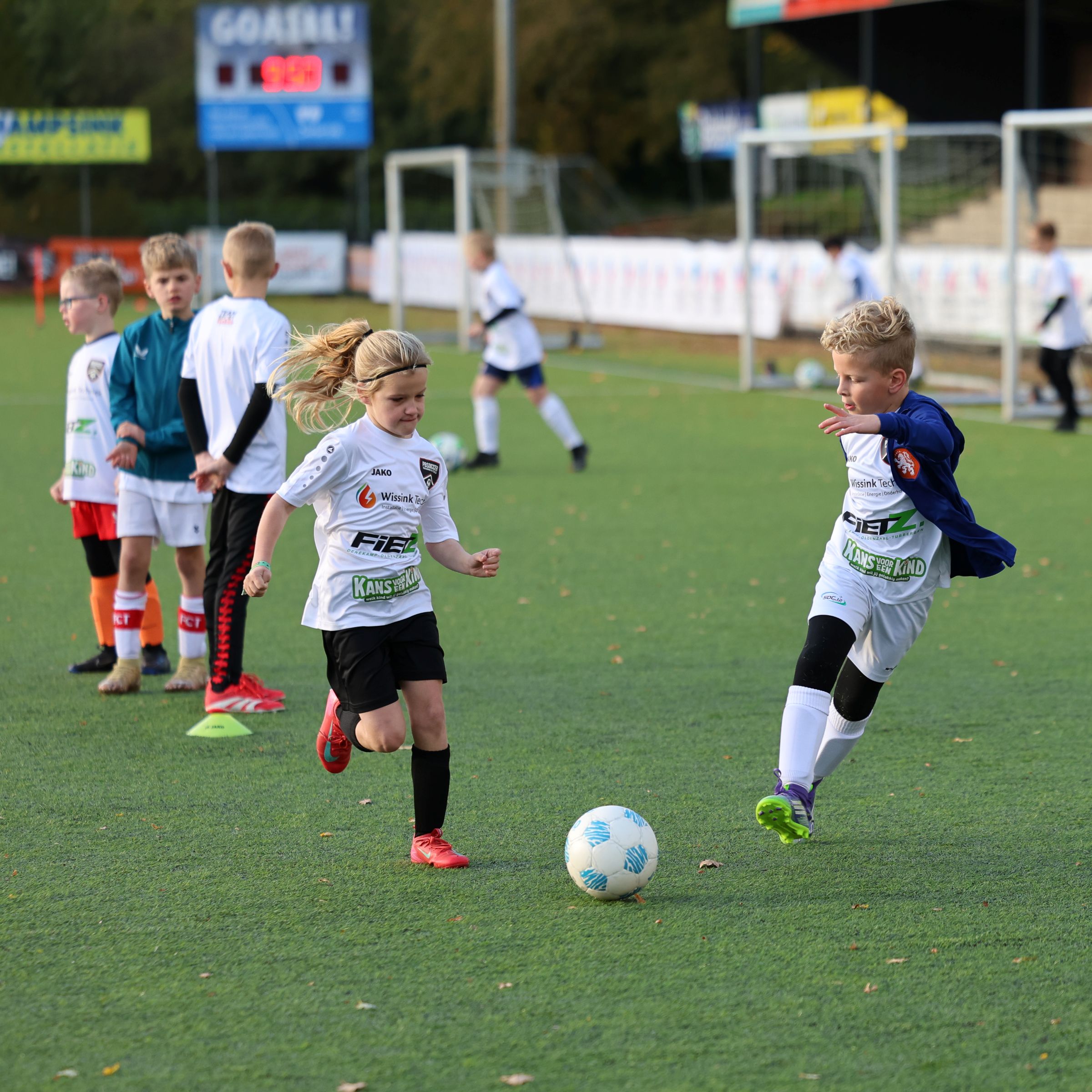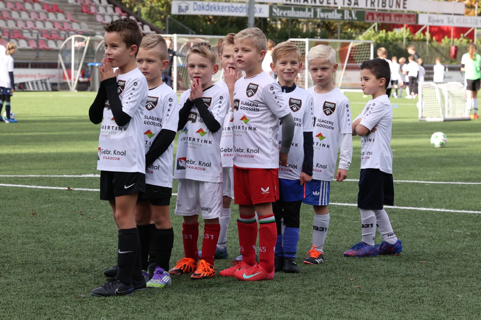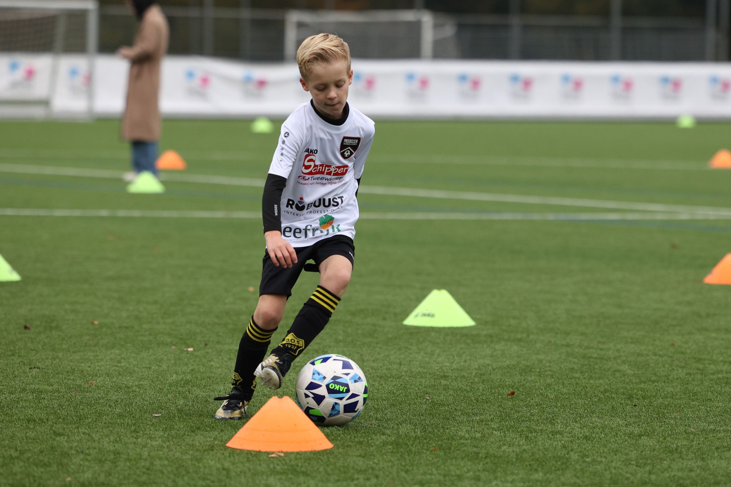 Allereerst moesten de kinderen zich aanmelden en vervolgens konden ze hun eigen profcontract tekenen. Even later was het openingswoord van organisator Patrick Bakhuis, de eigenaar van PB Soccer uit Almelo. Vervolgens konden de kinderen naar de kleedkamer. Daar hing aan een kapstok hun voetbalshirt klaar. Daarna volgde de groepsfoto op de tribune. Vervolgens stonden de kinderen opgesteld, wachtend totdat ze het kunstgrasveld konden betreden. Een mooie muzikale hymne galmde over de velden en door de oranje rook betraden de kinderen het hoofdveld. Kortom, mooie ingrediënten om gezamenlijk het kunstgrasveld te betreden onder luid applaus van vele ouders. Diverse oefeningen passeerden de revue die normaliter niet bij een voetbalvereniging worden gegeven. Denk aan het gatendoek, smartgoals (pionnen met lichtjes) etc…Hilarisch blijft het om de trainer met de groep van de fiets te schieten. Het enthousiasme straalde van de koppies.